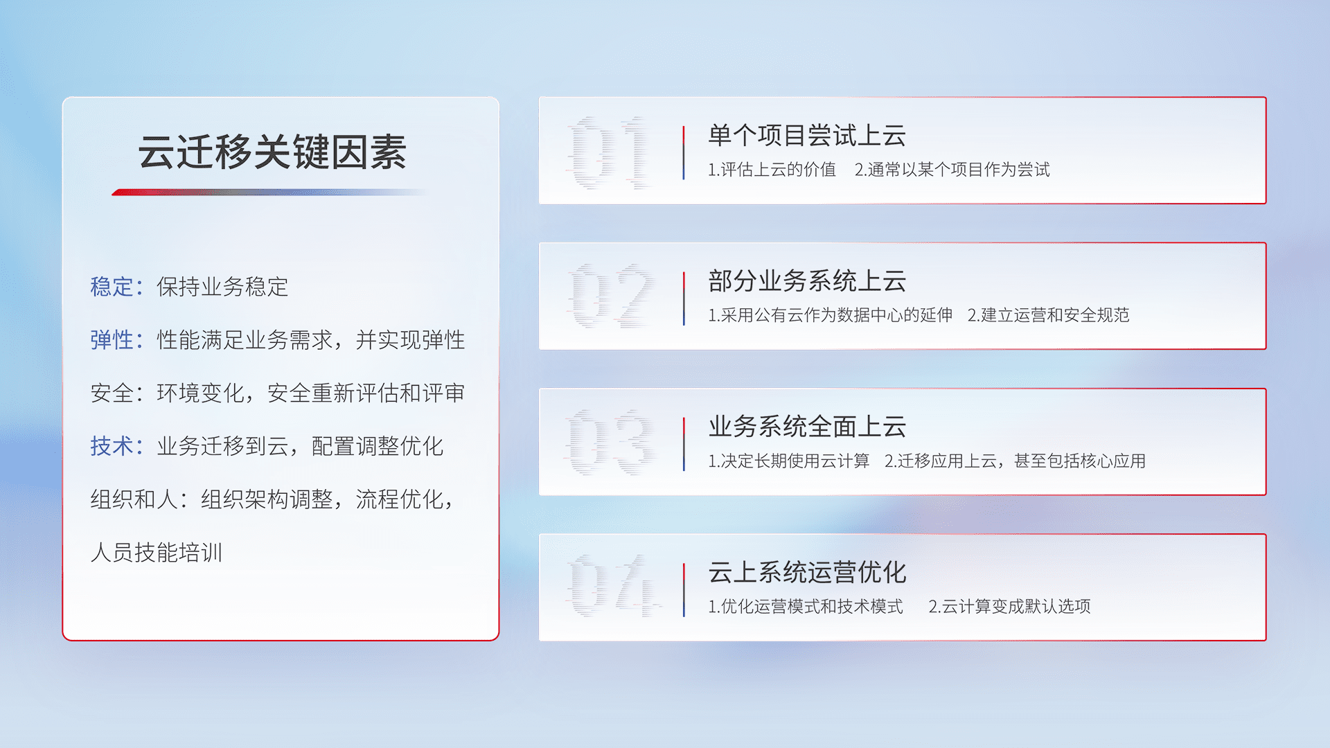 结合实际业务,,,从规划设计、、云平台选型、、、云原生改造、、、数据迁移、、集成交付,,迁移全过程为客户识别最佳上云路径,,做好风险识别管理,,设计网络架构、、、身份权限、、安全审计合规、、操作审计、、日志审计、、监控告警策略、、、多站点容灾设计等,,对云上基础设施进行整体规划,,,,提升IT治理水平,,以满足弹性、、高可用、、高性能的需求。。